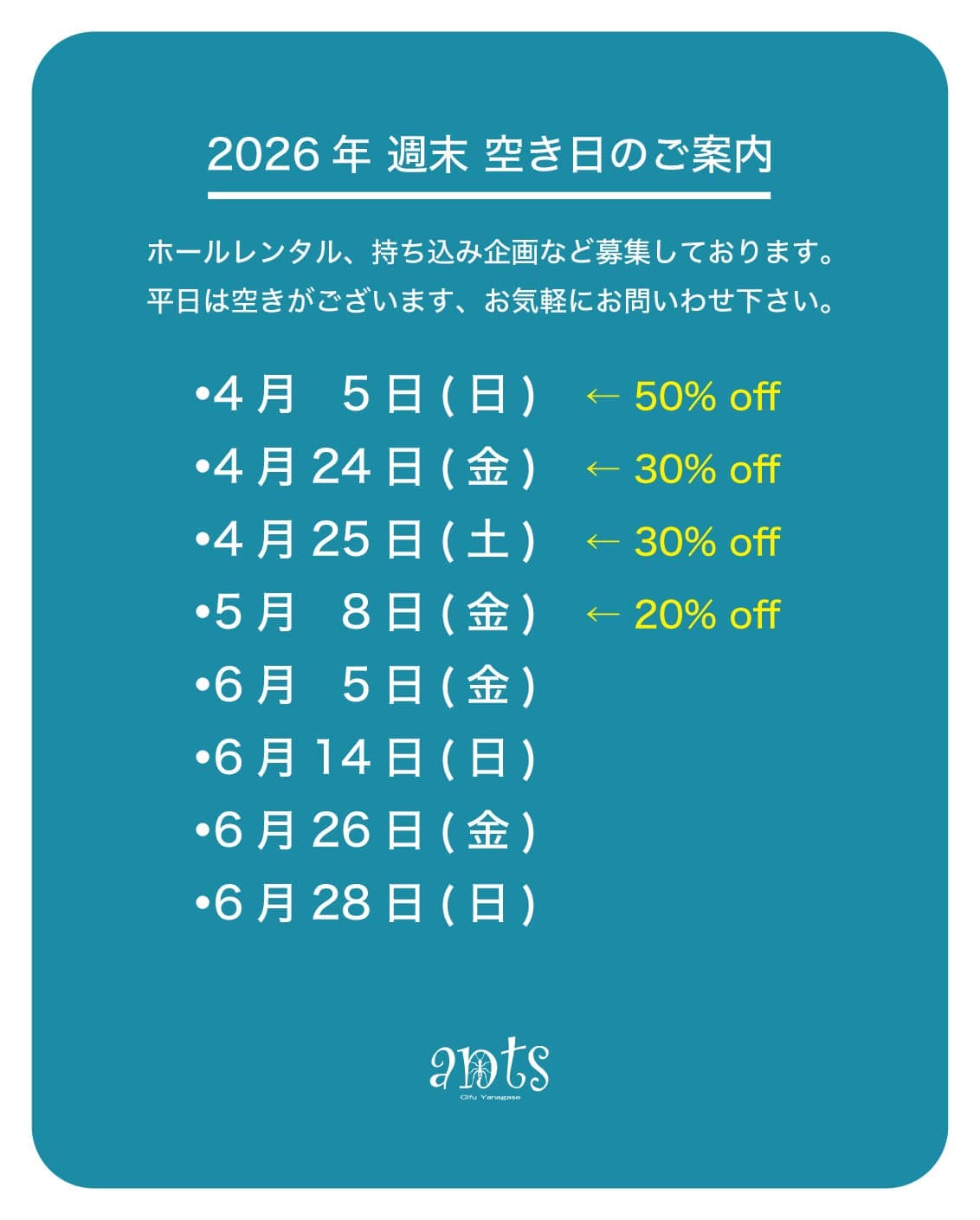 ライブのブッキング、ホールレンタル、持ち込み企画、結婚式二次会など、随時募集しております。また、地元岐阜の学生さんにはお得なプランもご用意しておりますので、気軽にお問わせ下さい。