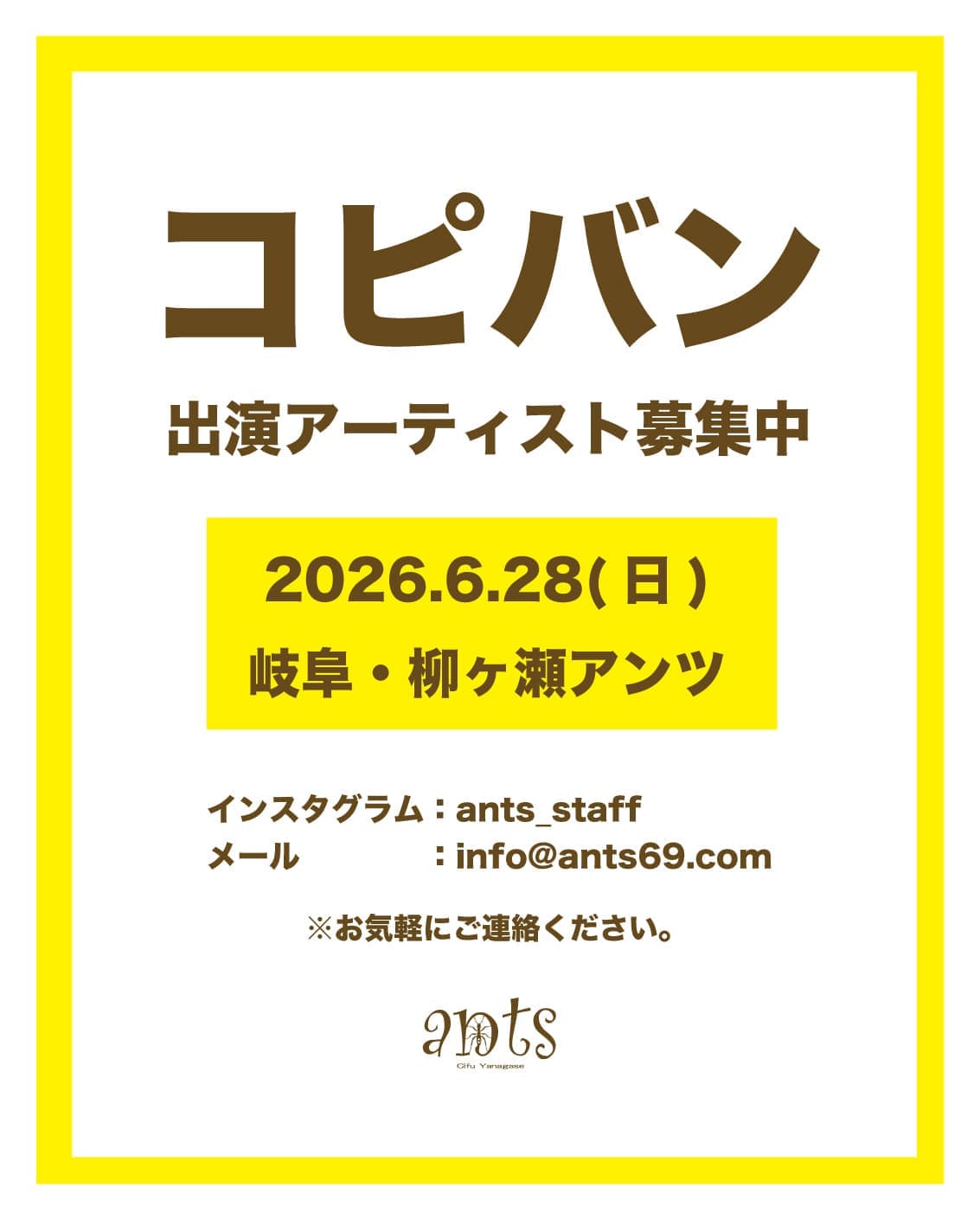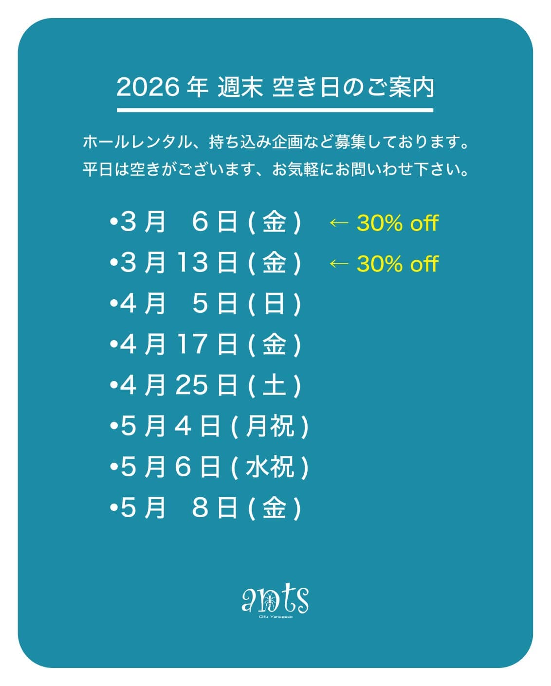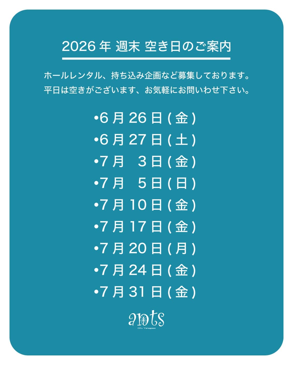 ライブのブッキング、ホールレンタル、持ち込み企画、結婚式二次会など、随時募集しております。また、地元岐阜の学生さんにはお得なプランもご用意しておりますので、気軽にお問わせ下さい。