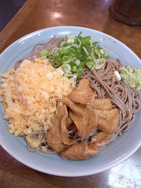 蕎麦に絡む濃いめのツユもとにかく絶品。通常の「並」だと少しもの足りなさを感じるせいか、みなさん「ひやしたぬきそばW(ダブル)」を注文します。この時点で蕎麦屋の「治郎系」ができあがり。 個人的にはアゲ推しなので「ひやしたぬきそばW(ダブル)あげ2枚増し」がベスト。